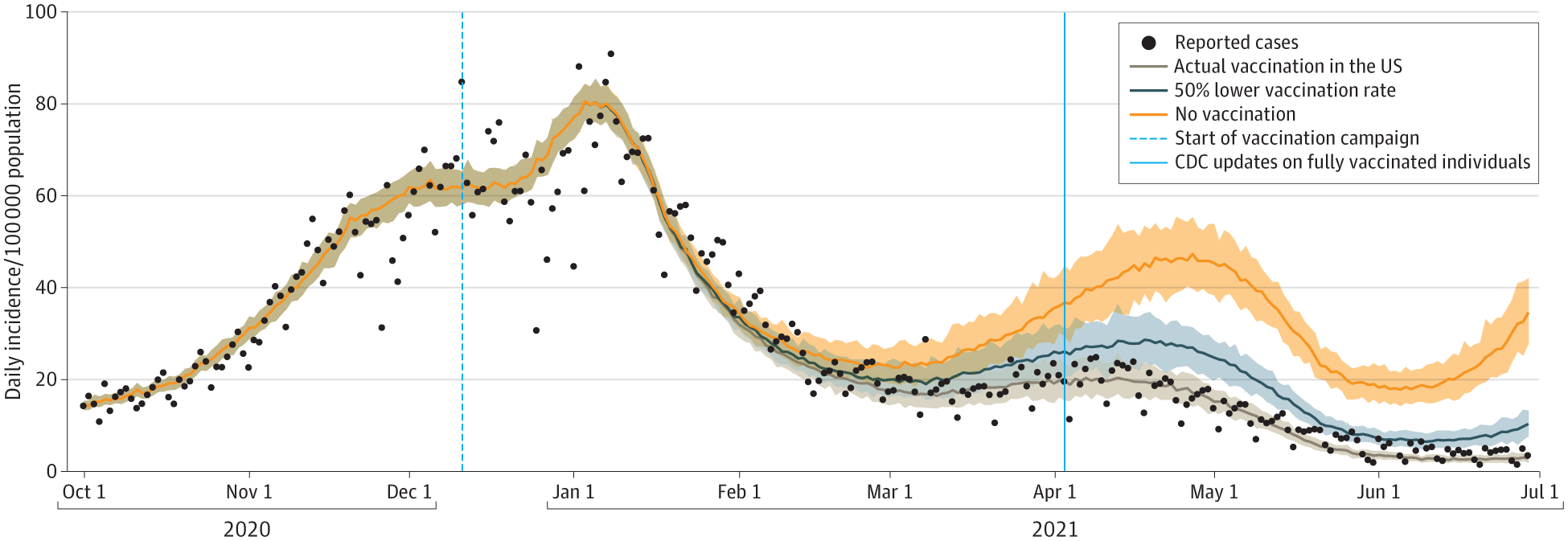 Rispetto allo scenario senza vaccinazione, la campagna di vaccinazione effettiva ha salvato una stima di 240.797 (95% CrI, 200 665-281 230) vite e ha impedito una stima di 1.133.617 (95% CrI, 967 487-1 301 881) ricoveri dal 12 dicembre 2020 al 30 giugno 2021. Il numero di casi evitati durante lo stesso periodo è stato proiettato a superare i 14 milioni. La vaccinazione ha impedito un'ondata di casi di COVID-19 guidata dalla variante Alpha che si sarebbe verificata nell'aprile 2021 senza vaccinazione, con un picco previsto di 4.409 (95% CrI, 2865-6312) morti e 17.979 (95% CrI, 13 191-23 219) ricoveri. Con il secondo scenario, con tassi di vaccinazione giornaliera alla metà del ritmo riportato, gli Stati Uniti avrebbero avuto ulteriori 77.283 (95% CrI, 48 499-104 519) morti e 336.000 (95% CrI, 225 330- 440 109) ricoveri.
