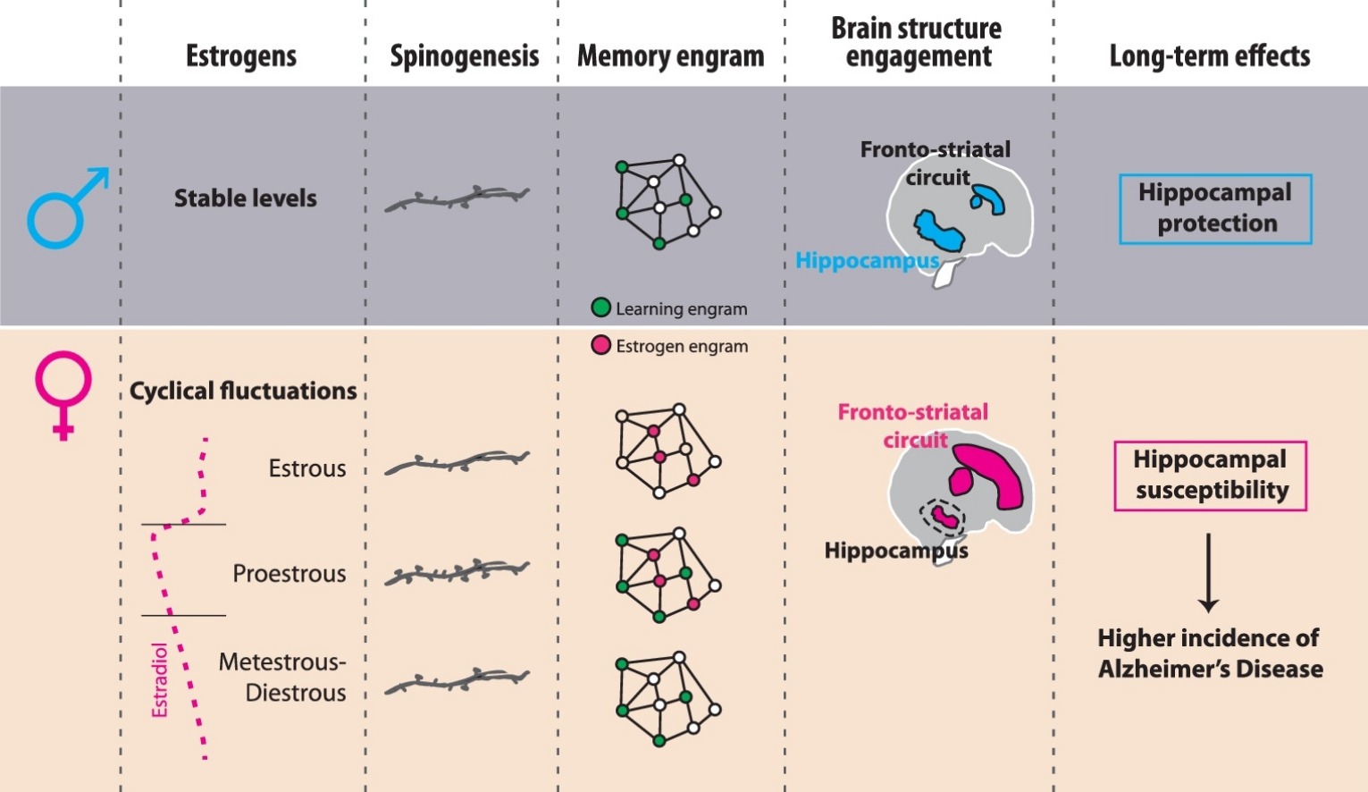 Fonti: Torromino G, Maggi A, De Leonibus E. Estrogen-dependent hippocampal wiring as a risk factor for age-related dementia in women. Prog Neurobiol. 2020 Aug 8:101895. doi: 10.1016/j.pneurobio.2020.101895. Epub ahead of print. PMID: 32781107.