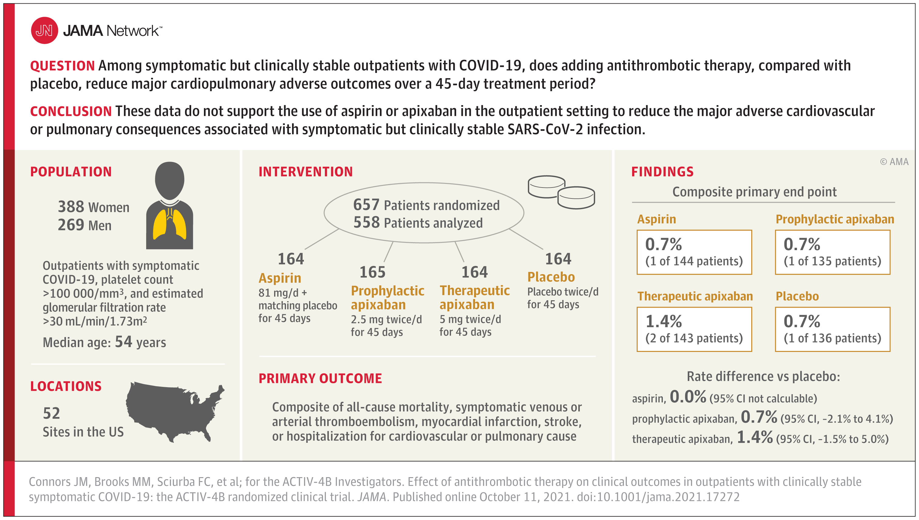 Sono stati randomizzati in totale 657 pazienti (età mediana, 54 anni [IQR, 46-59]; 59% donne). I tempi mediani dalla diagnosi alla randomizzazione e dalla randomizzazione all'inizio del trattamento dello studio erano rispettivamente di 7 giorni e 3 giorni. Tra i 558 pazienti che hanno iniziato il trattamento, l’outcome primario si è verificato in 1 paziente (0,7%) nel gruppo aspirina, 1 paziente (0,7%) nel gruppo apixaban da 2,5 mg, 2 pazienti (1,4%) nel gruppo apixaban da 5 mg e 1 paziente (0,7%) nel gruppo placebo.