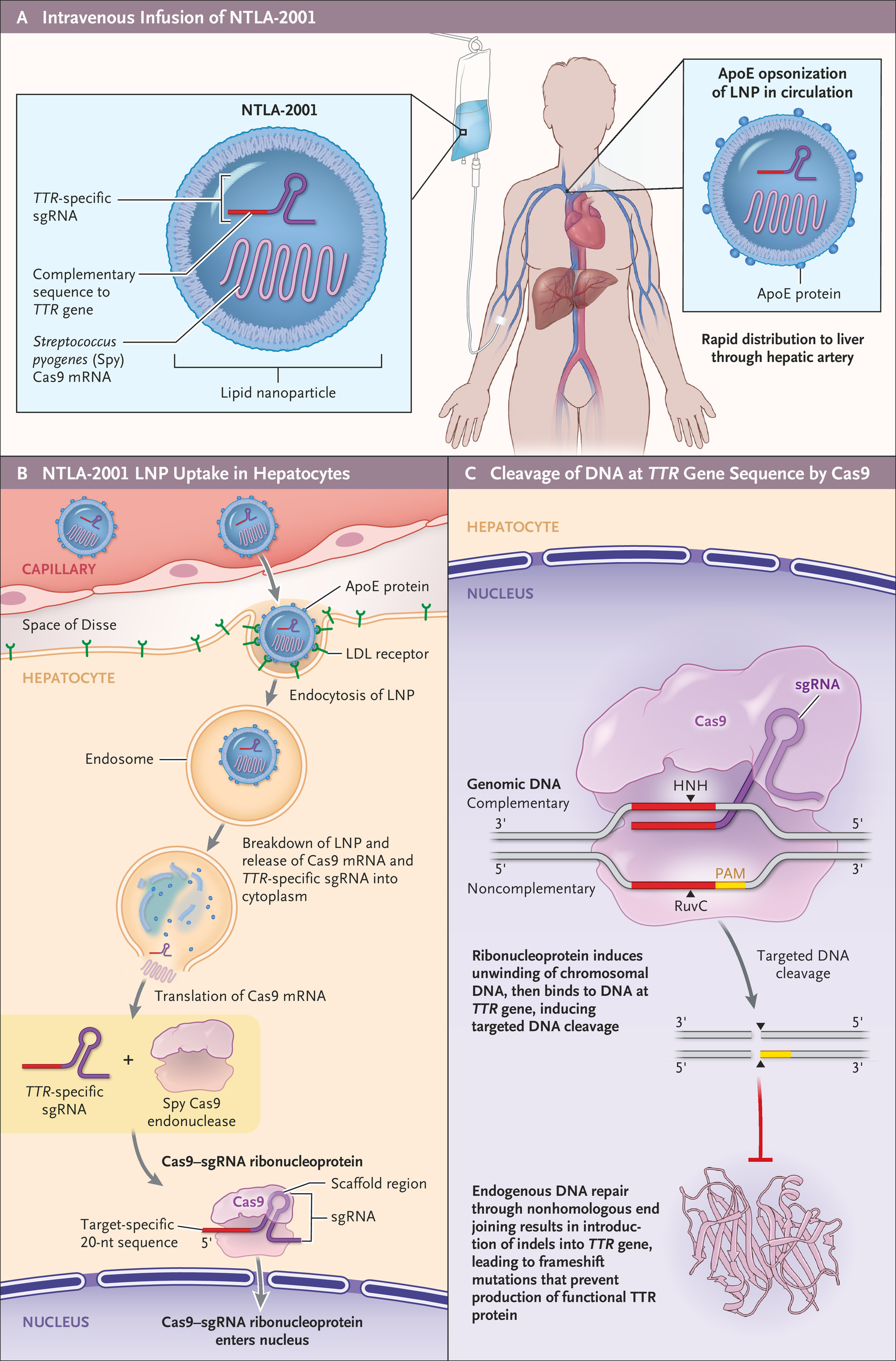 Lo studio, pubblicato sul NEJM, ha fornito dati provvisori su NTLA-2001 da un trial di fase I progettato per valutare la sicurezza, la tollerabilità, la farmacocinetica e la farmacodinamica di questo candidato alla terapia. NTLA-2001 consiste in un sistema di nanoparticelle lipidiche, con tropismo epatico, che trasporta due elementi: un RNA a guida singola (sgRNA) che ha come bersaglio il TTR umano e una sequenza di mRNA della proteina Cas9 dello Streptococcus pyogenes.