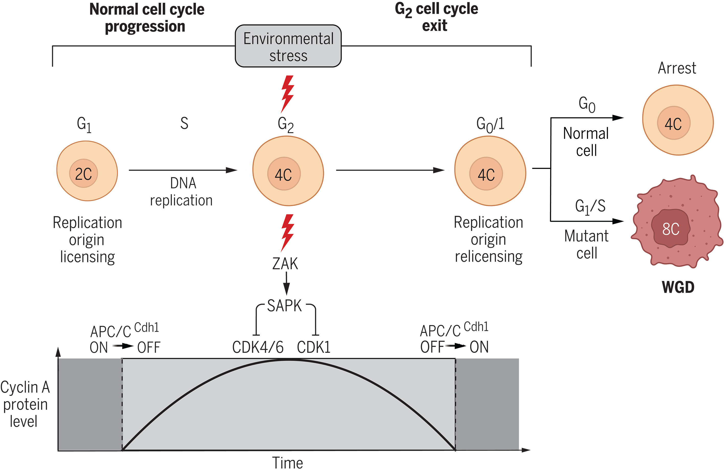 Attraverso un'altra serie di esperimenti, il team ha collegato un aumento dell'attività delle protein-chinasi attivate dallo stress (stress activated protein kinases, SAPKs) alla percentuale di cellule che superano la fase di quiete e continuano a raddoppiare il proprio genoma. "Meccanicamente, l'uscita dal ciclo cellulare G2 avviene tramite l'attivazione prematura del complesso anafasico o ciclosoma (APC/C) in G2", hanno scritto. "In particolare, abbiamo scoperto che la riattivazione prematura dell'APC/C si verifica con l'inibizione persistente e simultanea della chinasi ciclina-dipendente 1 (CDK1) e della CDK4/6 in G2 da parte delle SAPK".