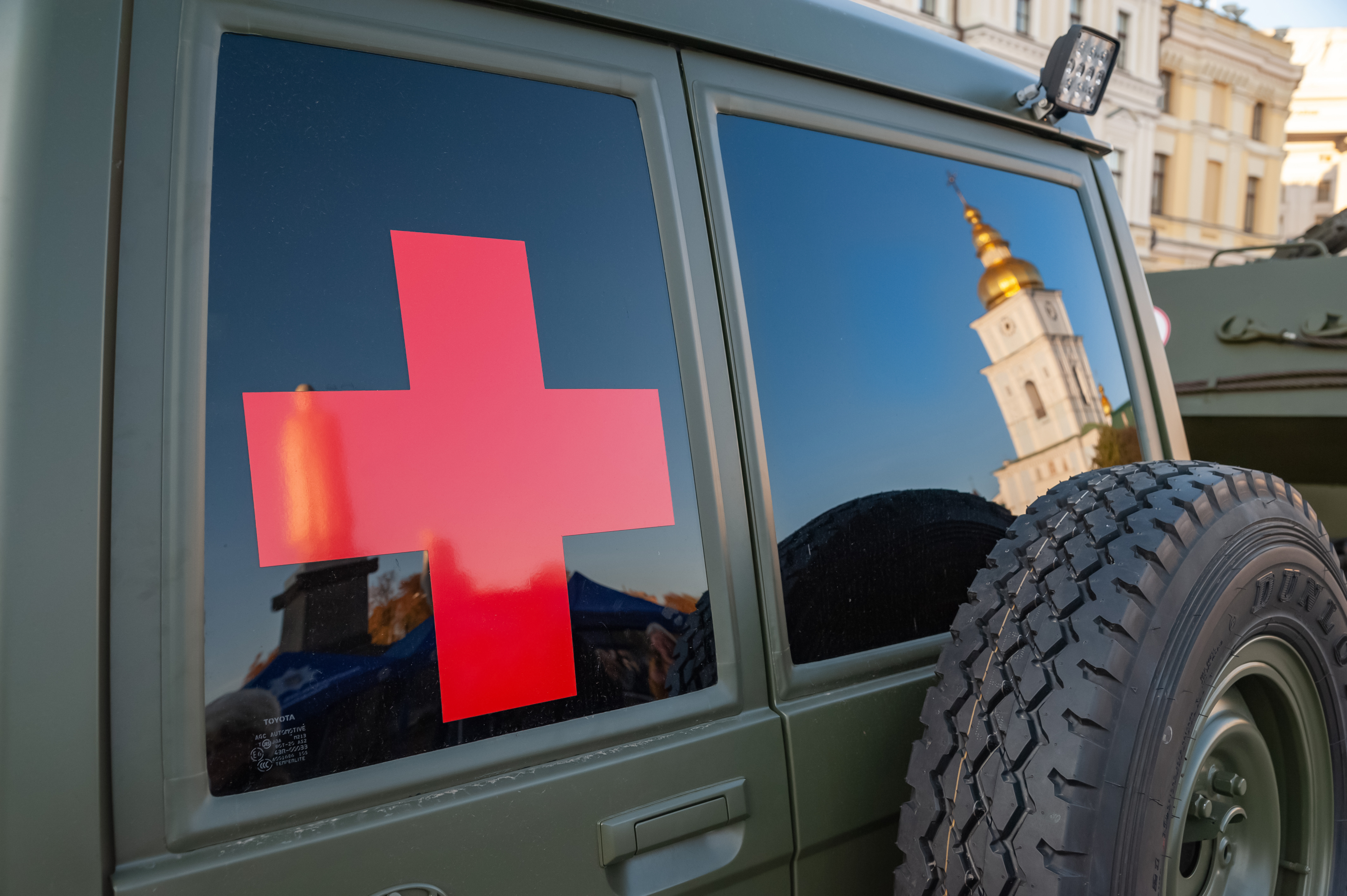 Una croce rossa sul finestrino di un veicolo medico militare dell'esercito ucraino, Kyïv 15 ottobre 2021 - credit: Alex Puhovoy, Adobestock
