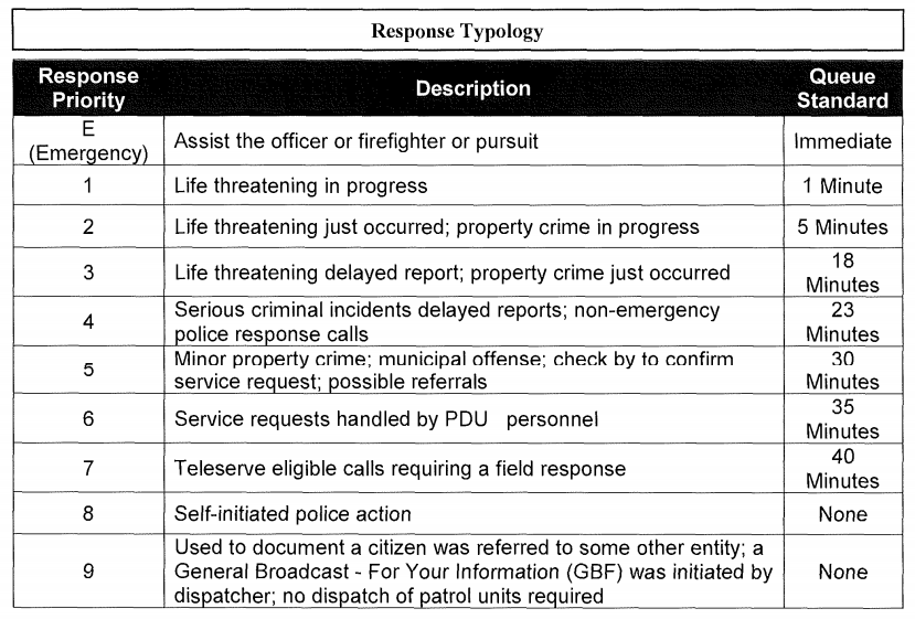 Questo sistema non è omogeneo in tutti gli Stati Uniti. I codici sono raccolti in una guida pubblicata dalle autorità di polizia locale... e ci sono tante guide quanti sono i PSAP. Tuttavia, c'è una definizione ampiamente accettata di chiamate di emergenza "priorità 1" (se c'è ragione di credere che esista una minaccia immediata alla vita) e "priorità 2" (c'è un rischio immediato di perdita o danno significativo alla proprietà).