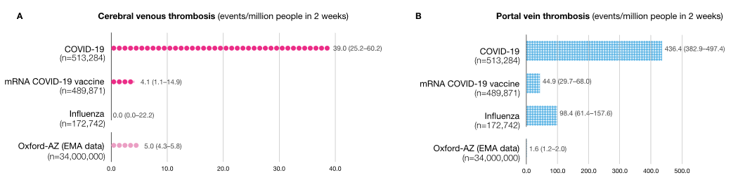 Riportano che la CVT è più comune dopo COVID-19 rispetto ad uno qualsiasi dei gruppi di confronto, con il 30% di questi casi che si verificano in under 30. Rispetto agli attuali vaccini COVID-19, questo rischio è tra 8-10 volte superiore, e rispetto ai dati basali, circa 100 volte superiore.