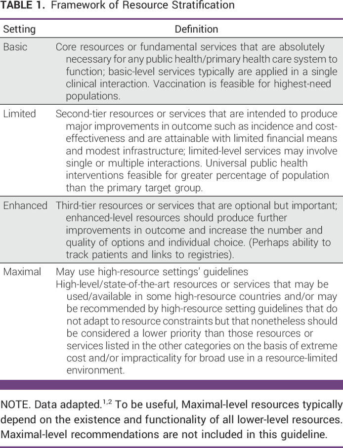 L'approccio a quattro livelli delle risorse utilizzato nello sviluppo delle linee guida spazia dal livello di base a quello massimale, considerando tra i due estremi un contesto limitato ed uno avanzato (in ordine crescente di risorse abbiamo, quindi: contesto di base, contesto limitato, contesto avanzato, contesto massimale). Questo quadro riconosce le variazioni non solo tra i Paesi, ma anche all'interno di essi. Qui di seguito vi riportiamo la tabella presente nelle linee guida.