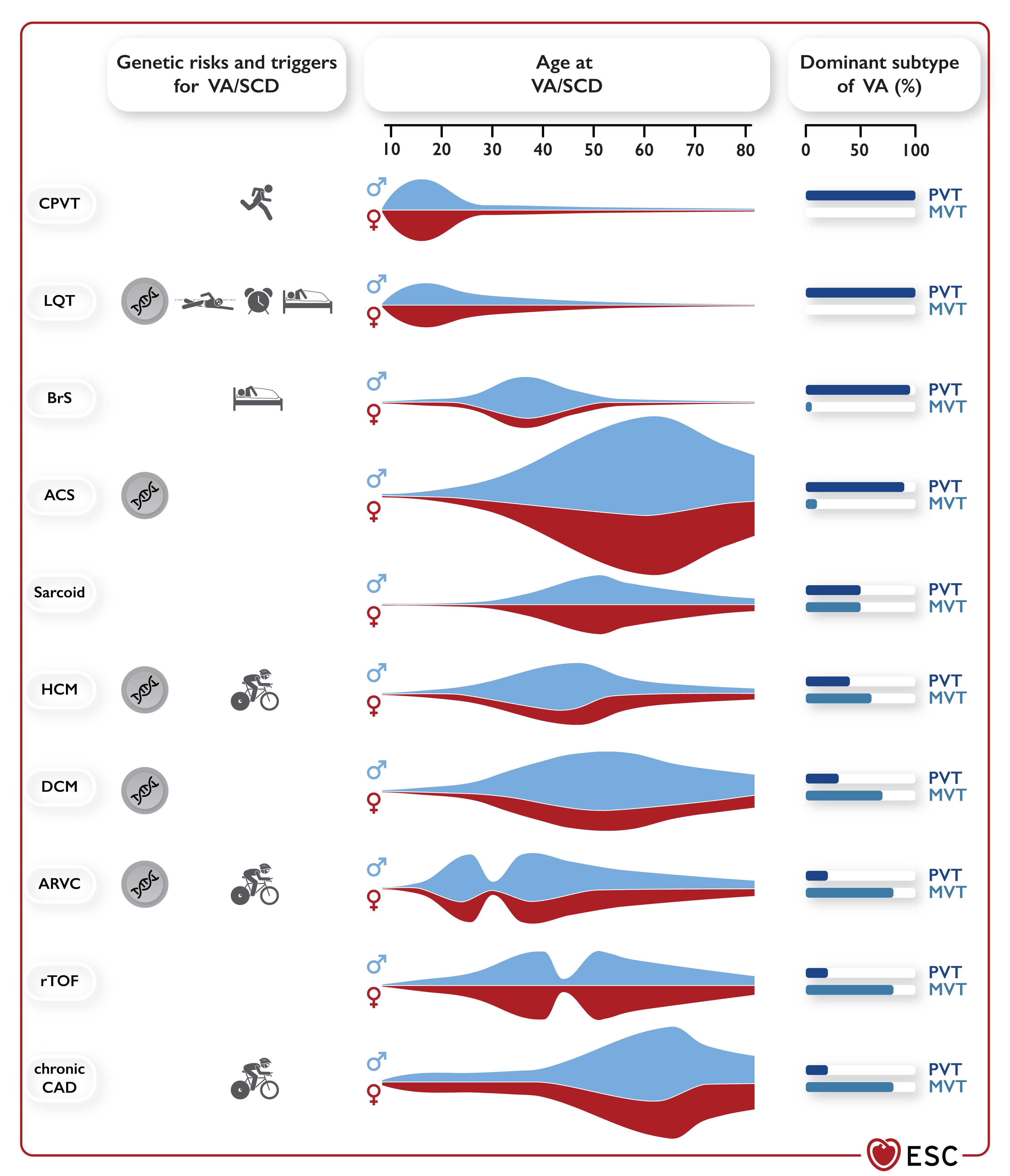 Fonte: Zeppenfeld K, Tfelt-Hansen J, de Riva M, Winkel BG, Behr ER, Blom NA, Charron P, Corrado D, Dagres N, de Chillou C, Eckardt L, Friede T, Haugaa KH, Hocini M, Lambiase PD, Marijon E, Merino JL, Peichl P, Priori SG, Reichlin T, Schulz-Menger J, Sticherling C, Tzeis S, Verstrael A, Volterrani M; ESC Scientific Document Group. 2022 ESC Guidelines for the management of patients with ventricular arrhythmias and the prevention of sudden cardiac death. Eur Heart J. 2022 Aug 26:ehac262. doi: 10.1093/eurheartj/ehac262. Epub ahead of print. PMID: 36017572.