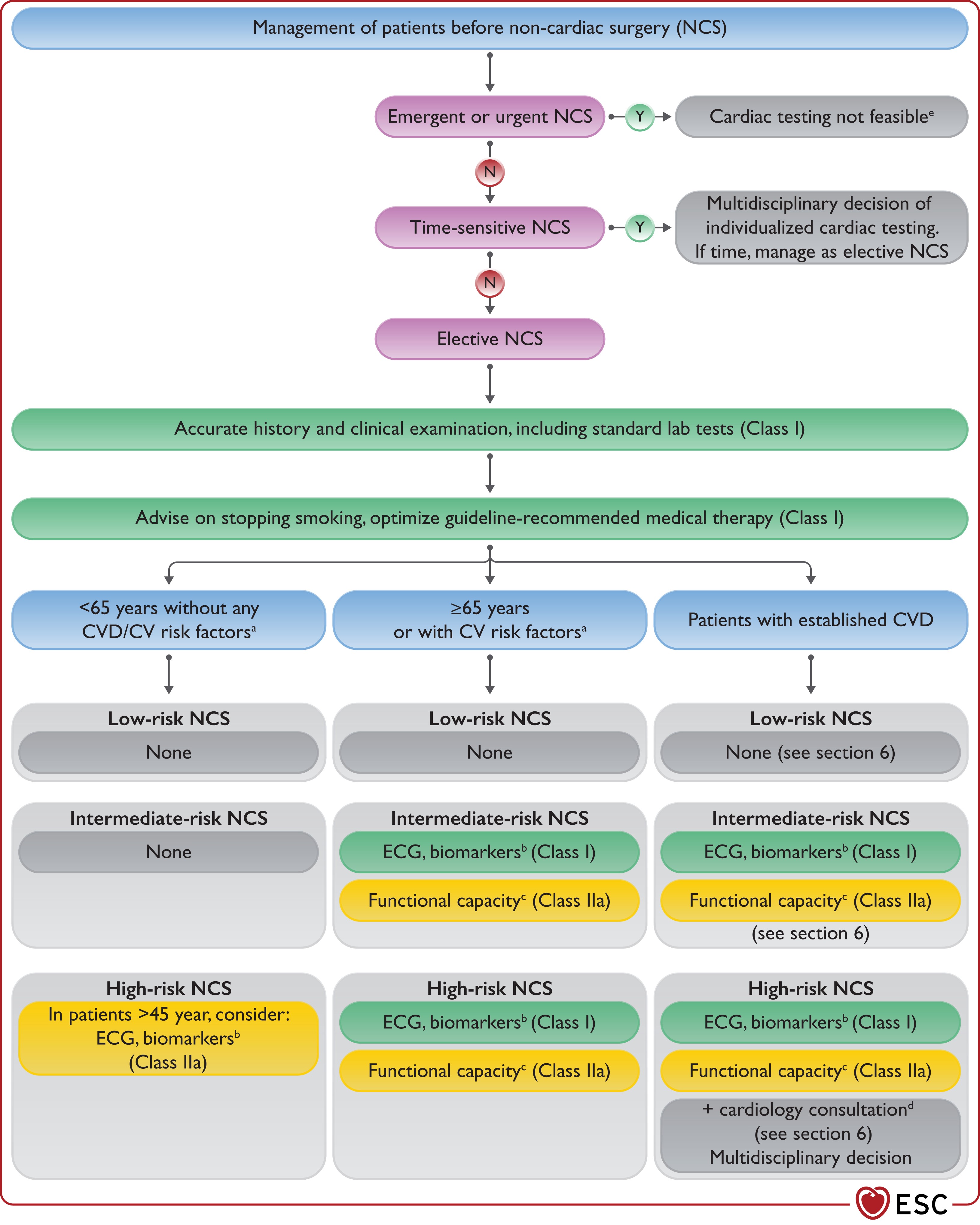 Halvorsen S, Mehilli J, Cassese S, Hall TS, Abdelhamid M, Barbato E, De Hert S, de Laval I, Geisler T, Hinterbuchner L, Ibanez B, Lenarczyk R, Mansmann UR, McGreavy P, Mueller C, Muneretto C, Niessner A, Potpara TS, Ristić A, Sade LE, Schirmer H, Schüpke S, Sillesen H, Skulstad H, Torracca L, Tutarel O, Van Der Meer P, Wojakowski W, Zacharowski K; ESC Scientific Document Group, Knuuti J, Kristensen SD, Aboyans V, Ahrens I, Antoniou S, Asteggiano R, Atar D, Baumbach A, Baumgartner H, Böhm M, Borger MA, Bueno H, Čelutkienė J, Chieffo A, Cikes M, Darius H, Delgado V, Devereaux PJ, Duncker D, Falk V, Fauchier L, Habib G, Hasdai D, Huber K, Iung B, Jaarsma T, Konradi A, Koskinas KC, Kotecha D, Landmesser U, Lewis BS, Linhart A, Løchen ML, Maeng M, Manzo-Silberman S, Mindham R, Neubeck L, Nielsen JC, Petersen SE, Prescott E, Rakisheva A, Saraste A, Sibbing D, Siller-Matula J, Sitges M, Stankovic I, Storey RF, Ten Berg J, Thielmann M, Touyz RM. 2022 ESC Guidelines on cardiovascular assessment and management of patients undergoing non-cardiac surgery. Eur Heart J. 2022 Aug 26:ehac270. doi: 10.1093/eurheartj/ehac270. Epub ahead of print. PMID: 36017553.