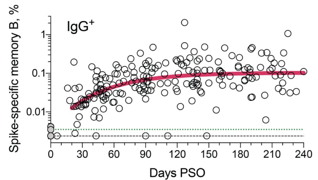 In particolare, in quasi tutti i pazienti COVID-19 sono state rilevate cellule della memoria B specifiche per la proteina spike o per RBD, senza apparente emivita a 5+ mesi dopo l'infezione. La memoria delle cellule B verso altre infezioni risulta essere di lunga durata. Le evidenze parlano di oltre 60 anni per il vaiolo e di oltre 90 anni per il virus influenzale che ha causato la pandemia del 1918. L’emivita delle cellule T della memoria osservata in questa coorte per oltre 6 mesi dall’insorgenza dei sintomi (~166-271d per CD8+ e ~96-174d per le cellule T CD4+) è paragonabile a quella osservata nelle cellule T della memoria CD8+ subito dopo l'immunizzazione per la febbre gialla (123d t1/2). Confrontando i dati con le conoscenze attuali sul comportamento del sistema immunitario nei confronti di altri virus, i ricercatori ipotizzano che la memoria delle cellule T potrebbe raggiungere un plateau più stabile, o una fase di decadimento più lenta, oltre i primi 6 mesi dall’infezione.
