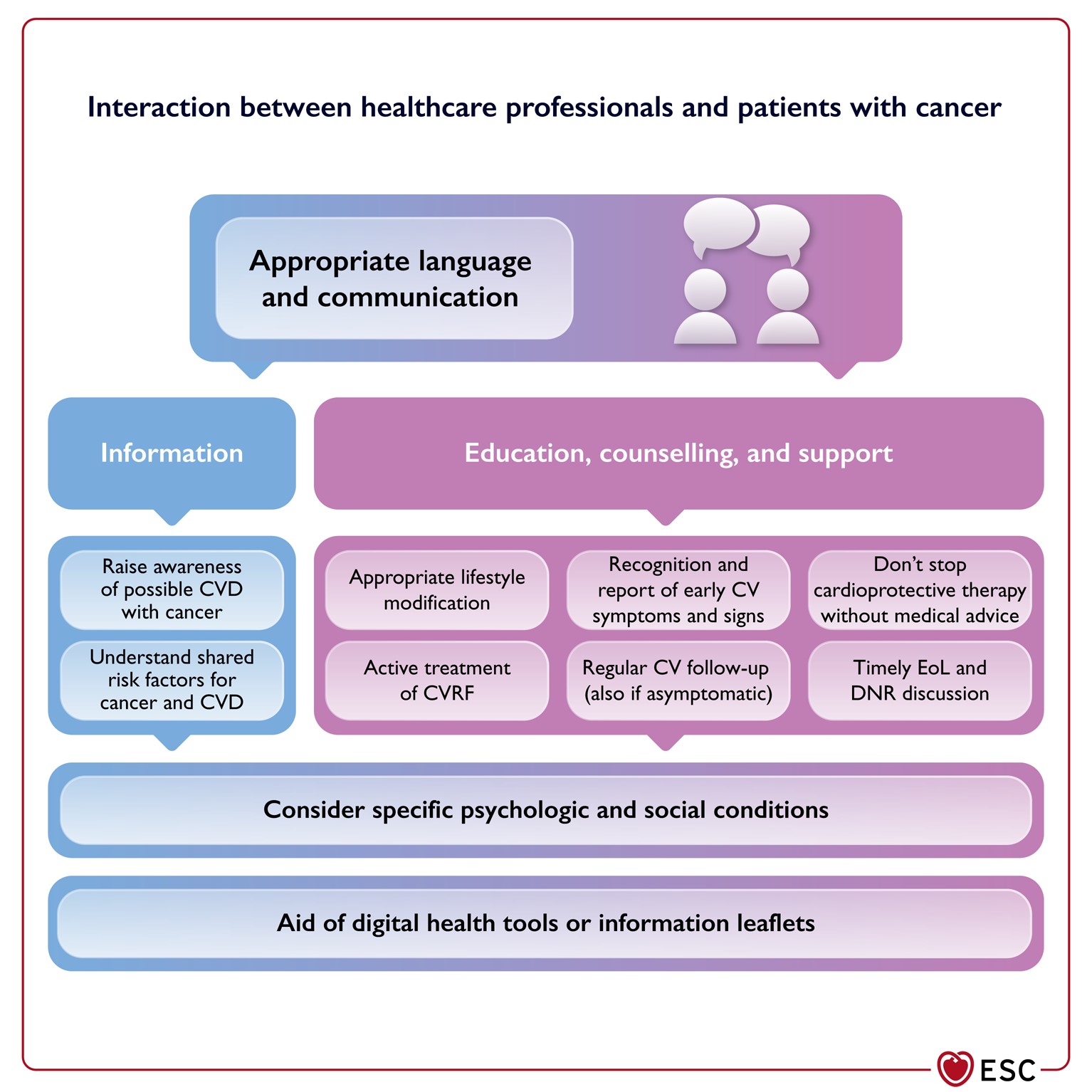 - Si raccomanda di educare i pazienti con cancro a riconoscere i segni e i sintomi precoci di CVD (classe I, C).