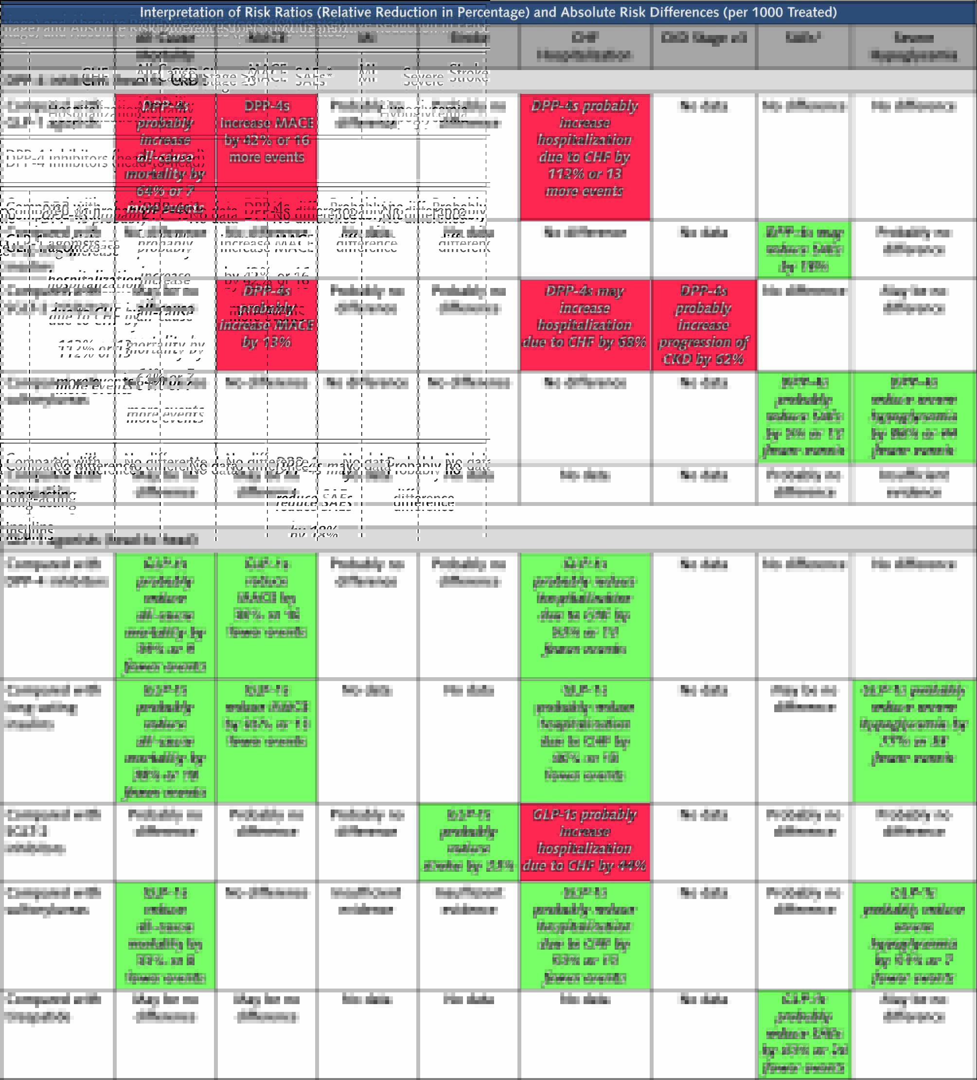Le evidenze della meta-analisi a rete suggeriscono che gli inibitori della DPP-4 possono aumentare l'ospedalizzazione per CHF (congestive heart failure) e probabilmente aumentare il rischio di MACE e di progressione della CKD rispetto agli inibitori del SGLT-2. Rispetto agli agonisti del GLP-1, gli inibitori della DPP-4 probabilmente aumentano la mortalità per tutte le cause e l'ospedalizzazione per insufficienza cardiaca e il rischio di MACE.
