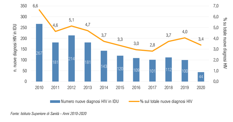 Nel 2020, sono state segnalate al Sistema di sorveglianza AIDS 352 nuove diagnosi, 27 delle quali riferite a IDU, pari al 7,7% delle diagnosi totali, mentre nel periodo 1987-1990 la percentuale è stata dieci volte superiore.