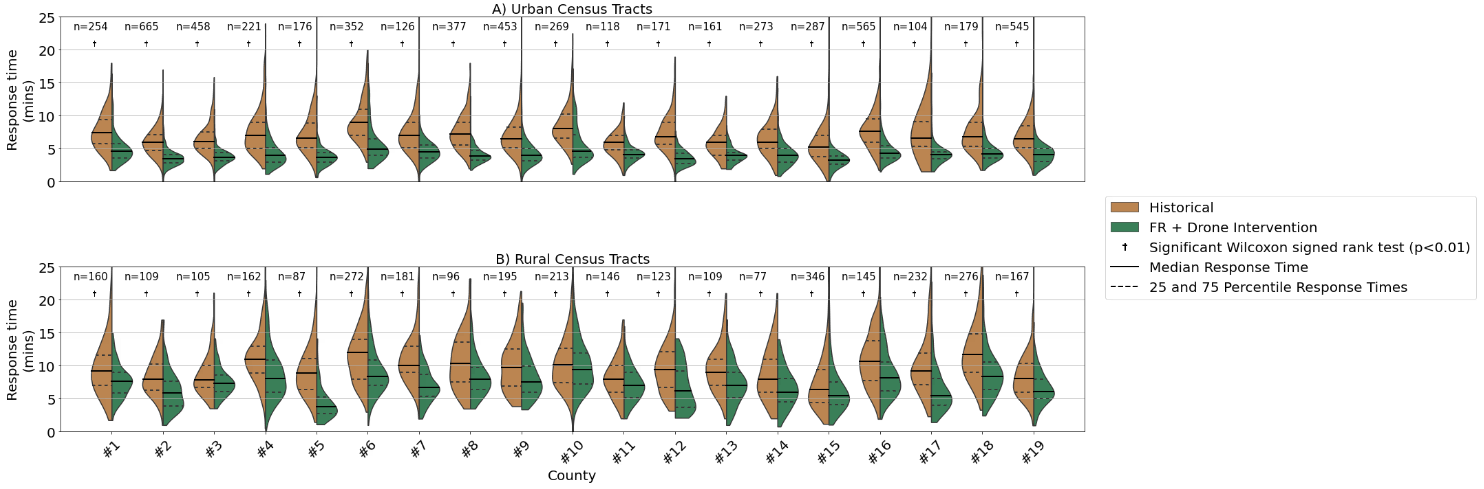 I risultati hanno mostrato che il tempo di risposta storico mediano era di 6,9 minuti nelle zone urbane e 9,4 minuti nelle zone rurali. L'intervento dei primi soccorritori e dei droni ha ridotto i tempi di risposta mediani stimati del 42% a 4,0 minuti nelle aree urbane e del 24% a 7,1 minuti nelle aree rurali. La copertura entro 5 minuti è migliorata dal 24% al 77% nelle aree urbane e dal 10% al 23% nelle aree rurali. Tutte le contee hanno mostrato un significativo miglioramento nei tempi di risposta sia per la popolazione urbana che rurale.