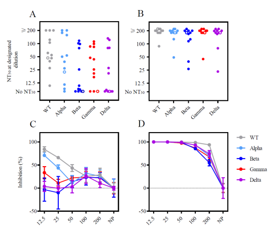 I risultati mostrano una quantità assoluta di IgG anti-Spike superiore nel gruppo eterologo. Inoltre, nel gruppo omologo il titolo di neutralizzazione al 50% (NT50) era moderato contro il virus wild type e variante alfa, e ulteriormente diminuiva per le altre varianti.