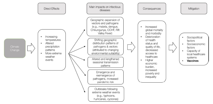 La review citata sopra esamina le principali malattie infettive prevenibili con vaccino, associate al mutamento climatico, le fasi di sviluppo del vaccino per tali malattie e le loro sfide.