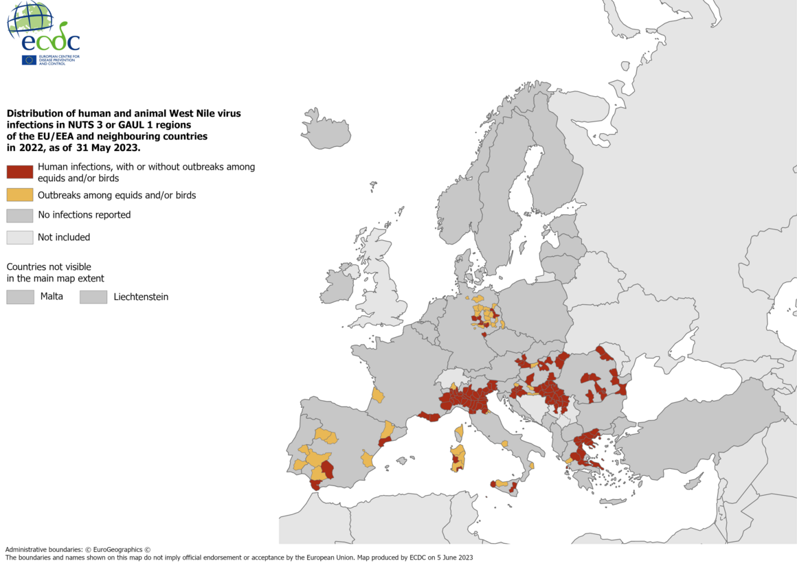 Distribuzione WNV in Europa (photocredit: ECDC)